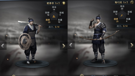 士兵分为步兵、弓兵、骑兵和战车四种,其中步兵克制弓兵,弓兵克制骑兵,骑兵克制步兵,战车则无相对克制。