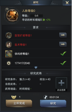 寻访派遣的武将魅力越高,所需的时间越短,而且魅力85以上才可能寻访到橙将。建议开服第三天拿到魅力+4的宝物,给蔡文姬装备。学问府的辅助类科技也可以先学习下人脉科技,满级可以缩短10%的时间。