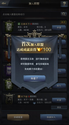 加一个好的联盟是很至关重要的。加入联盟时必须要关注的是联盟的战斗力,强大的联盟可以为自己的发展提供庇护。一般来说战斗力靠前的大盟战斗力低的玩家是比较难以申请进入的,这时也可以选择加入大盟的分盟。入盟之后多关注盟内的聊天,如果被人攻打时可以请求盟友援救。战争时要做到同仇敌慨,而不是各自为战。