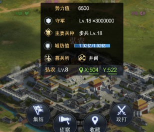 至于攻打城市的兵种选择,我们可以点击城市看该城市的兵种(每天都可能出现变化),然后可以遵照“步克弓,弓克骑,骑克步,战车无克制”选择对应兵种。而战车是攻城必备的兵种,只有战车才能打掉城防值,而且城防值对于城市守军是有战力加成的。
